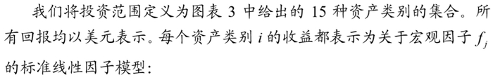 为了使方法更具体,我们使用宏观因子和广泛的资产类别进行研究,资产类别的数目超过了因子的数目,资产类别收益是宏观因子的线性函数。当然,我们的例子是说明性的,该方法可以推广到任何一组因子和资产类别。