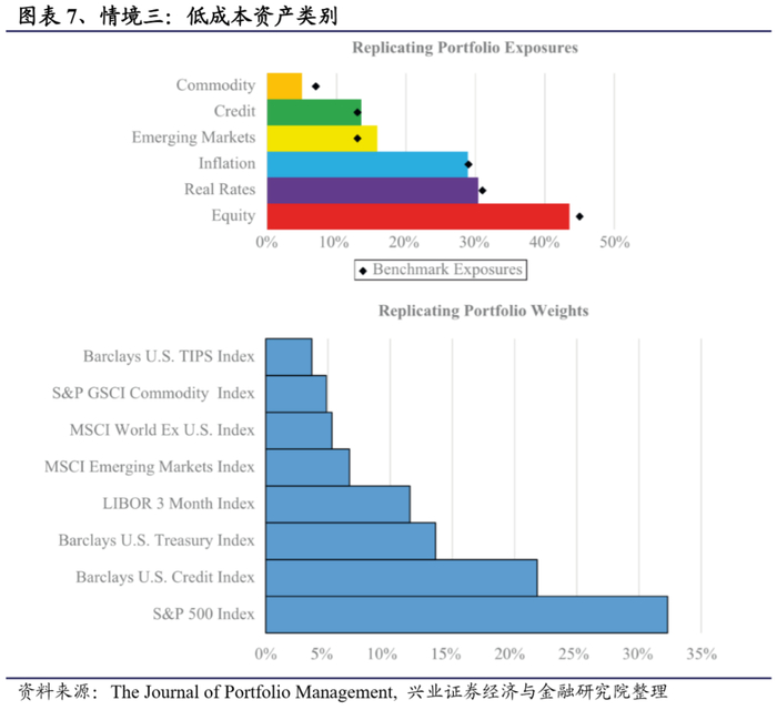 在这种情景下,我们设置了2.5%的最小交易量限制和纯多头限制,并将投资组合平均费用率的上限设置为0.20%。结果表明,对具有高费用率的资产类别(例如另类资产)的配置受到了限制,最优化结果更偏向于具有低费用率的资产类别(例如标普500指数)。图表7的结果表明,最优化投资组合的因子暴露与因子基准暴露的偏差很小。结合前两种方案,我们可以得出,许多潜在的资产配置可以提供相似的因子暴露。最终,根据约束条件确定了唯一的最优资产类别投资组合,以表示给定的因子暴露。