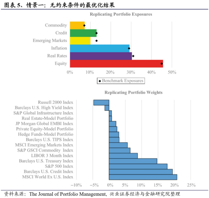 在这种情景下,我们只使用一个限制条件:将资产权重之和限制为100%。图表5显示了因子配置和复制投资组合(replicating portfolio)。复制投资组合的因子配置与我们的目标暴露紧密匹配。但是,复制投资组合含有大量的小额持股,这在经济上是没有意义的。此外,对罗素2000指数和巴克莱美国高收益指数(Barclays U.S. High Yield Indices)也有负的配置,但这部分由私人市场资产(如私募股权和房地产)抵消掉了。正如现在所观察到的,使用约束可以消除这些不良的性质。