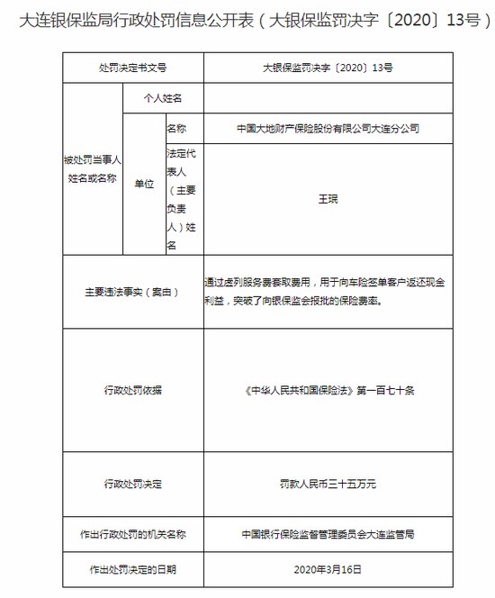 被罚、被罚、被罚,又被罚,据银保监会官网4月1日,大连银保监局行政处罚信息公开表(大连银保监罚决字〔2020〕13号)显示,中国大地财产保险股份有限公司(以下简称:大地财险)大连分公司,通过虚列服务费套取费用,用于向车险签单客户返还现金利益,突破了向银保监会报批的保险费率。罚款人民币35万元。