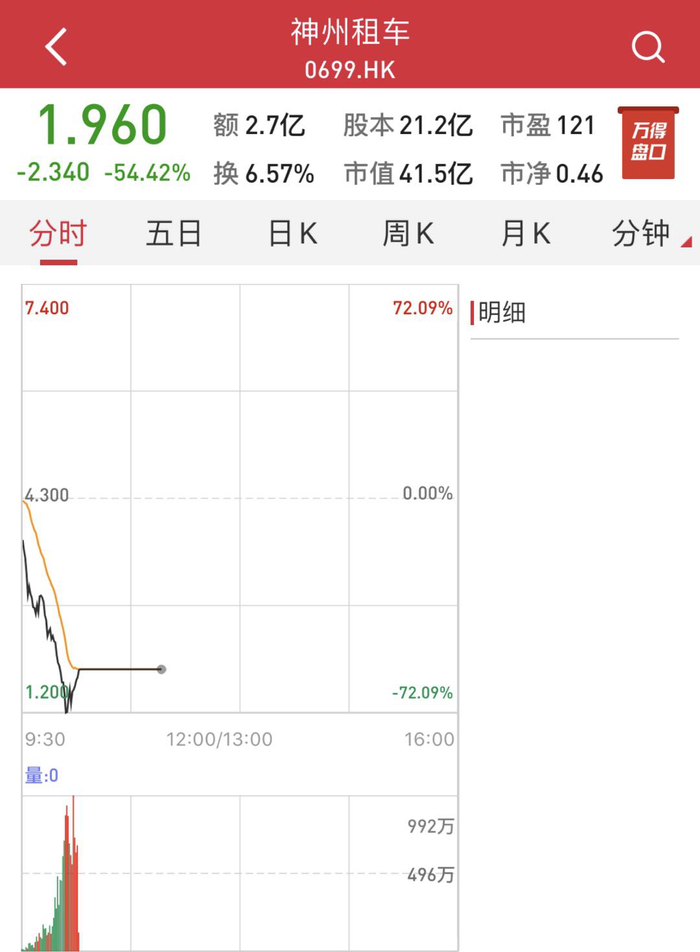 2020年4月3日一开盘,神州租车(0699.HK)的股价就大幅跳水,跌幅不断扩大 ,随后停牌,截至《商学院》记者发稿,神州租车股价1.96港元/股,市值蒸发超30亿港元,最低时仅1.2港元,市值蒸发超50亿港元。