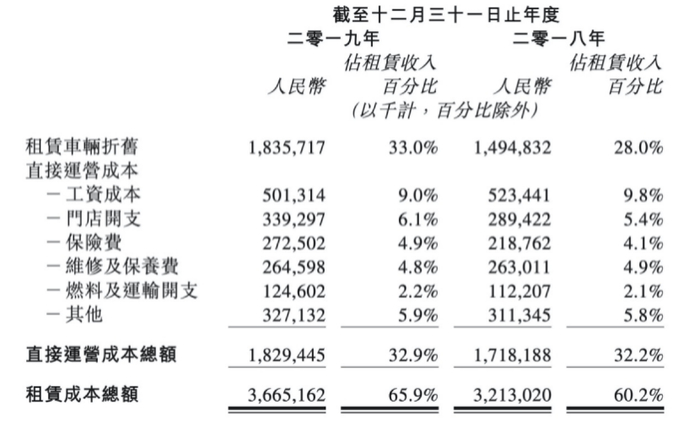 具体而言,2019年神州租车的租赁车辆的成本总额为36.65亿元,较去年同期32.13亿元相比增加4.52亿元,占租赁收入的比例由60.2%攀升至65.9%。