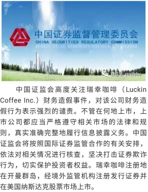 4月3日,中国证监会已在官方微信发文,对瑞幸公司的财务造假行为表示强烈谴责。