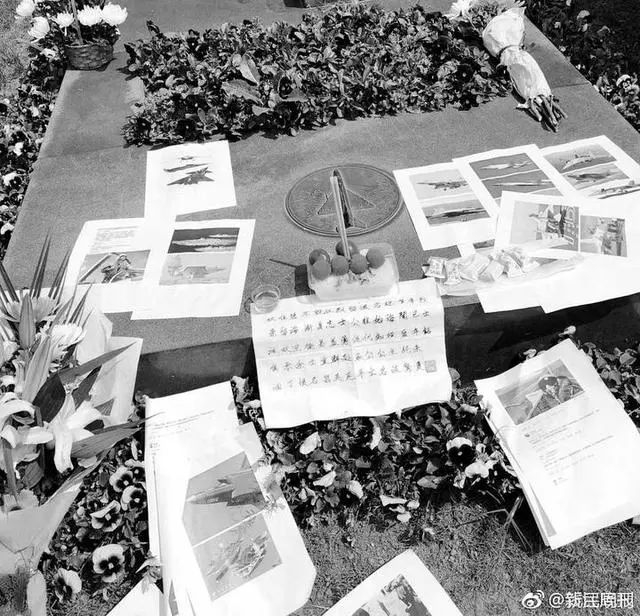 在鲜花中间,还摆放着一架歼-20战斗机模型。19年前中美撞机事件中,王伟驾驶的是歼-8II战斗机,在祭台上也印有这款战机的图形。