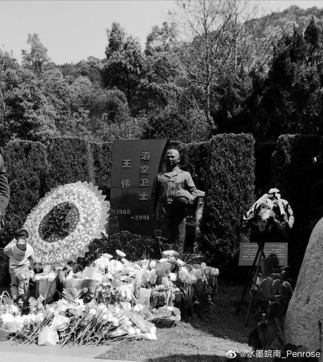 松柏之间,挺立着一尊王伟的铜像,身着飞行服,左手托飞行帽。铜像身后,是一块高2米多的黑色石碑,形状很像他生前驾驶的战斗机的尾翼,上面刻着“海空卫士:王伟”,还有一行数字:1968—2001。铜像边上,立着一块牌子,刻着王伟的生平介绍。