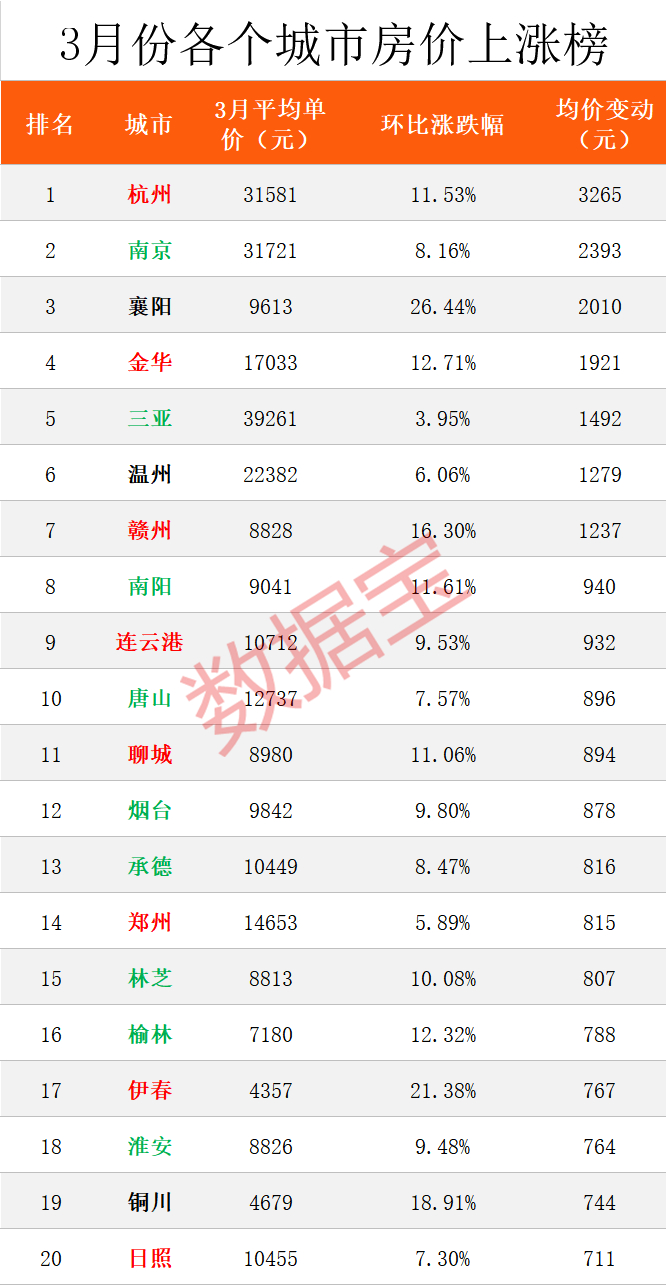 杭州风头正劲,连房价也咄咄逼人。3月份,杭州二手房均价达到31581元,环比上涨11.53%,每平涨3265元,位居全国房价上涨榜首位。值得一提的是,杭州房价的变化可能更多的是成交结构性的原因,其2月份房价环比下跌超过2.38%,同比下跌11.79%。南京位居次席,3月二手房均价达到31721元,环比上涨8.16%,每平涨2393元。
