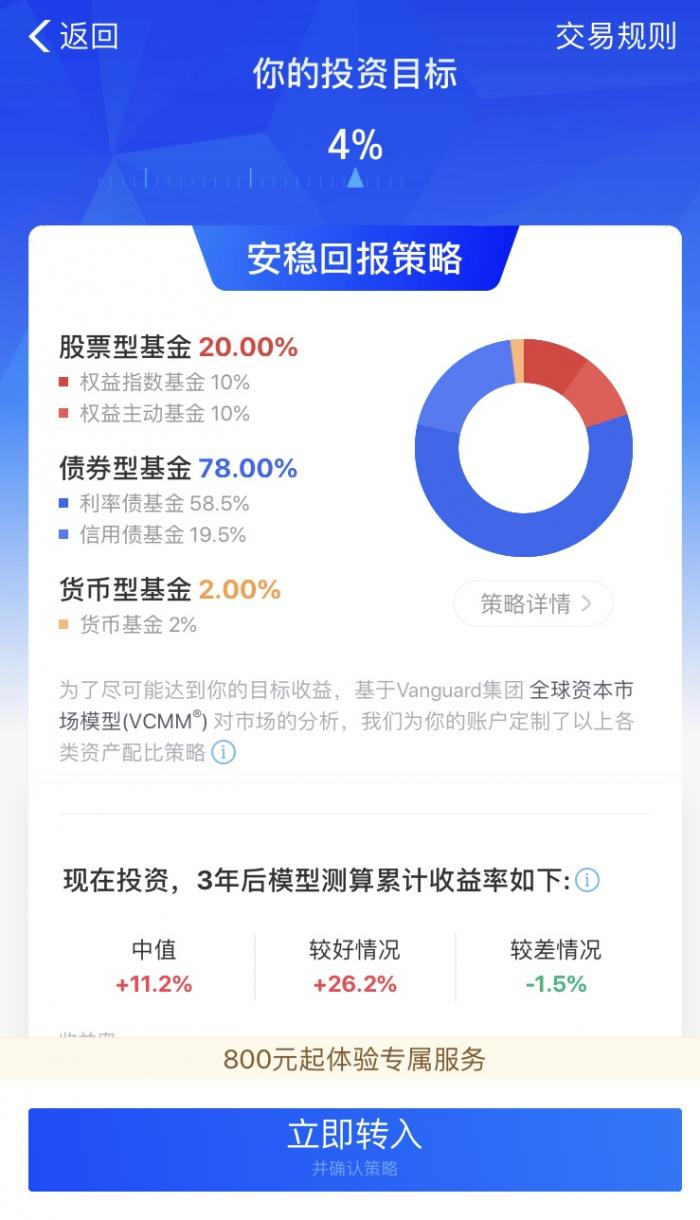 如上图,经过评测,记者的投资目标被定为4%,是安稳回报策略,系统给出的投资建议是,20%的股票型基金,78%的债券型基金和2%的货币型基金。