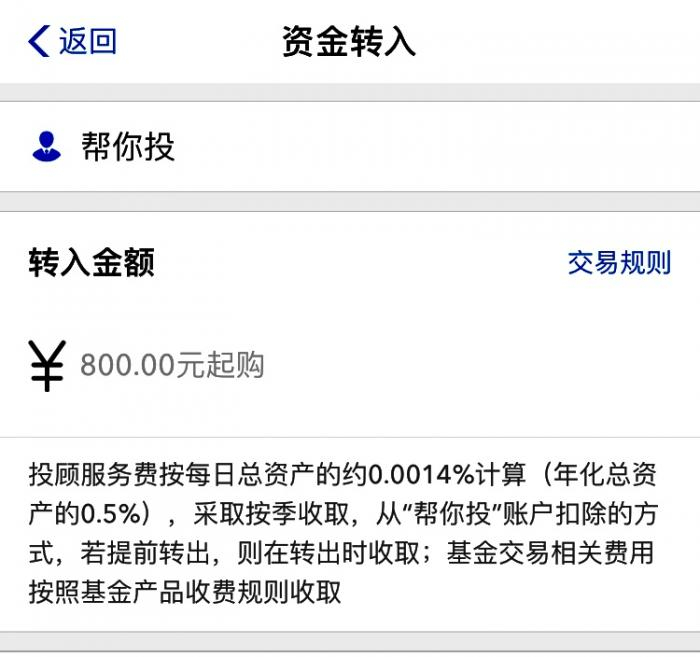 投顾服务费按每日总资产的约0.0014%计算(年化总资产的0.5%),采取按季收取,从“帮您投”账户扣除的方式,若提前转出,则在转出时收取。