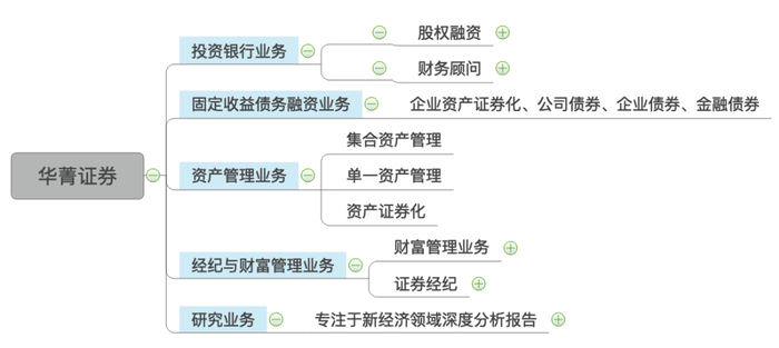 华菁证券目前业务范围包括:证券经纪、证券投资咨询、证券承销与保荐、证券资产管理,具体业务部门如下: