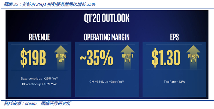 从英特尔看服务器回暖,此前对服务器业务一季度展望同比增长25%,疫情有望催化加速。英特尔在19Q4数据中心集团(DCG)第四季度净营收为72.13亿美元,同比增长19%,远超市场预期,其中云服务提供商部门的收入增长48%,通信服务提供商部门的收入增长14%。预计随着公司转型战略不断推进和AI等技术发展及全球数据的爆炸式增长,DSG业务占公司整体业务比重将会继续提升,并且四季度公司完成对Habana Labs的收购后,未来或将拉动该项业务保持持续增长。