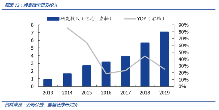 持续进行研发投入,在CPU/GPU封测领域具有较强技术优势,支持国产客户研发与量产。2019年,公司研发投入金额为7.05亿元,同比增长25%。研发占营收比重为8.53%,同比增长0.75个百分点。公司研发人员数量为1516人,占比为12.37%。苏州厂不仅是第一个为AMD 7纳米全系列产品提供封测服务的工厂,而且公司充分利用苏州、槟城的高端CPU、GPU量产封测平台,支持国产CPU、GPU、网关服务器、基站处理器、FPGA(现场可编程门阵列)等产品的研发和量产。