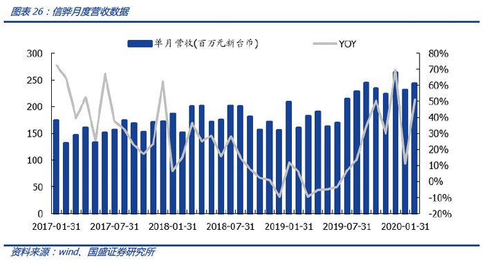 服务器上游芯片表现高景气,2020-01/02月度同比增长分别为11%/51%。从台湾信骅的月度数据,也可以看到2020年1月、2月数据的强劲增长。信骅是服务器BMC远程管理芯片龙头企业,市占率高达60~70%。信骅的短期经营波动,可以较好反映服务器市场的景气程度。