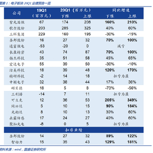 半导体核心标的业绩同比高增长,国产替代趋势持续受益。兆易创新19Q4营收环比接近持平,考虑到4000万元的未决诉讼计提,实际盈利能力也较强。Nor Flash供不应求,产业链偏紧张,目前看行业仍保持向上趋势。圣邦股份公司19Q4收入/归母净利润为2.58亿元/5612万元,同比增速+88%/+75%,收入环比增长2000万元,继续环比加速成长,预计Q1~Q2有望保持稳步增长。