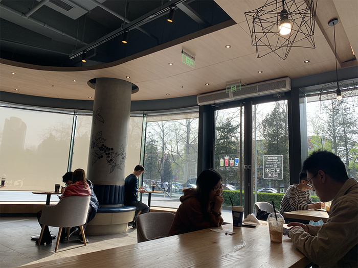 在面积近百平米的望京SOHO2店门口,贴着“使用人数上限6人,今日复工3人”的公示,燃财经到店时,店内只有六名顾客,其中有两位在楼上上班的顾客拎着4个咖啡袋走了出来,进入了旁边的写字楼。同样在光华路SOHO二期店,因为处于非工作日,生意冷清。