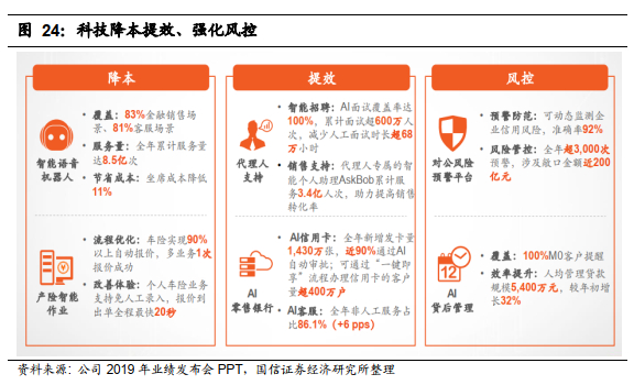 成本管控:平安运用领先科技对金融流程进行全面的优化改造,提升作业效率,优化客户体验。其中,平安产险运用智能机器人等技术实现询报价、录单、出单、批改等环节流程自动化与智能化,个人车险业务90%以上实现自动化报价,多业务1次报价成功。此外,平安打造的智能语音机器人全年累计服务量达8.5亿次,可实现每年坐席成本下降11%。