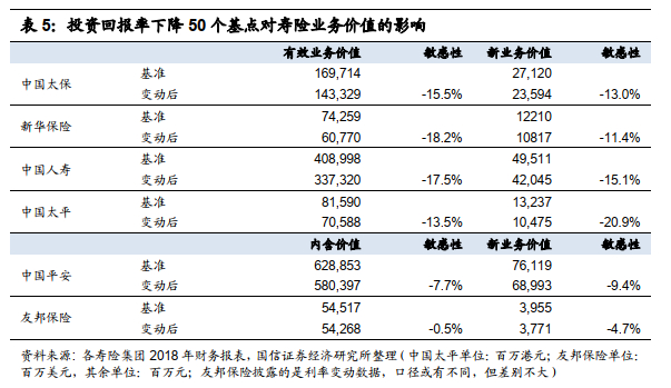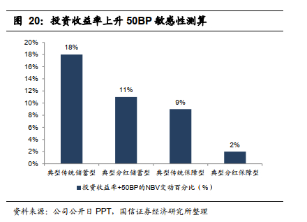 投资波动和折现率变动主要影响寿险及健康险业务。(1)对于投资波动的影响,由于长期投资收益率假设为5%,实际投资收益率波动将影响会计报表变动;此外,IFRS9下,更多金融资产将计入“以公允价值计量且变动计入当期损益的金融资产”科目,投资收益波动加大。剔除短期投资波动后,寿险及健康险业务投资回报率锁定为5%。(2)对于折现率变动的影响,由于责任准备金的提取是依据750日移动平均国债收益率曲线贴现,利率变动对当年利润影响较大。