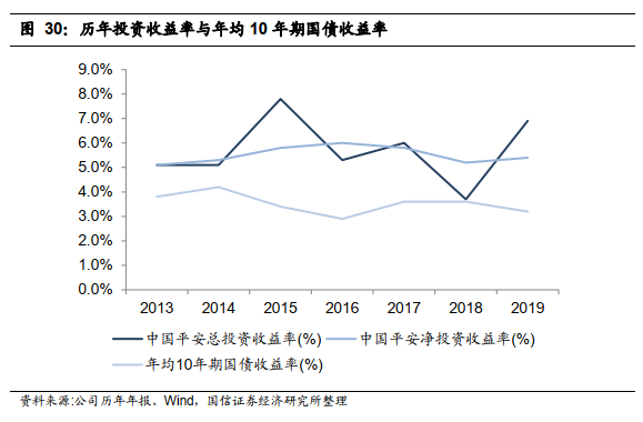 传统分红万能均衡发展,降低利率敏感性。中国平安利率风险敞口显著低于同业,我们认为,其产品策略是主要原因。由于分红、万能险等险种投资风险由保险公司和保户共同承担,保险公司承担的是保底利率部分的风险。当市场利率下跌时,保险公司下调分红水平和结算利率,分红、万能险等负债现金流具有部分浮息债的特性,投资收益率敏感性降低。据测算,当投资收益率上升50个基点时,传统保障型、分红保障型、传统储蓄型、分红储蓄型新业务价值敏感性分别为9%、2%、18%、11%。2019年,公司分红险、万能险、传统寿险、长期健康险、意外及短期健康险、年金、投连险规模保费占比分别为29.3%、16.7%、19.5%、17.5%、9.1%、0.2%。业务均衡发展,能有效降低利率敏感性。