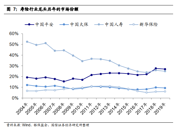 寿险具备明显的集中于龙头的行业格局,我们认为该特征使得龙头公司处于强者恒强的优势地位,可视为长期护城河。2019年,寿险行业的保费收入达到2.27万亿元,中国平安、中国人寿、中国太保、新华保险保费收入分别为6116、5684、2124、1381亿元,其市场份额分别是25%、27%、9%、6%,合计达到67%。
