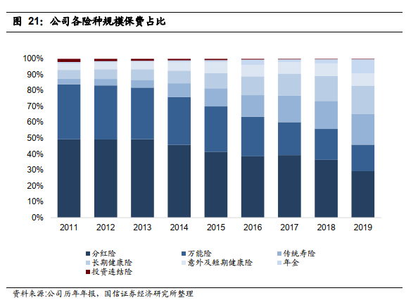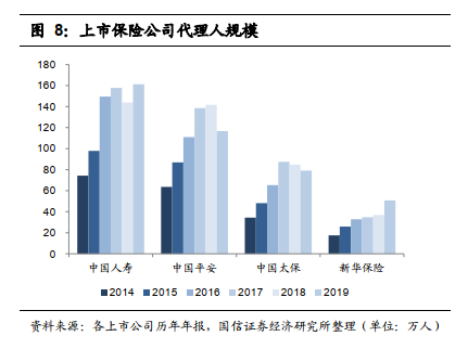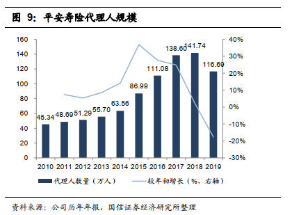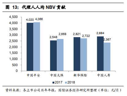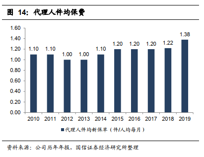 代理人粗放式增长时代已过,量质提升是重要抓手。考虑到寿险产品的“隐性需求”特征,代理人相比于产品而言,对险企经营具备更强的决定力,这也是为什么寿险公司转型都从转换渠道开始的根本原因。2014-2018年,代理人数量高速增长对个险新单、新业务价值起了重要的拉动作用。但目前,代理人高速增长红利期已逝,代理人改革是重要抓手。从公司NBV结构来看,代理人渠道NBV占比90%以上,2019年占比为90.4%。2019年末,公司代理人规模为117万,较年初下降17.7%。2019年公司坚定推进寿险改革,通过优才计划升级队伍。主动淘汰低端产能,聚焦高价值,人均产能有望进一步提升。