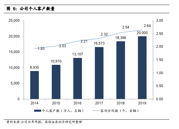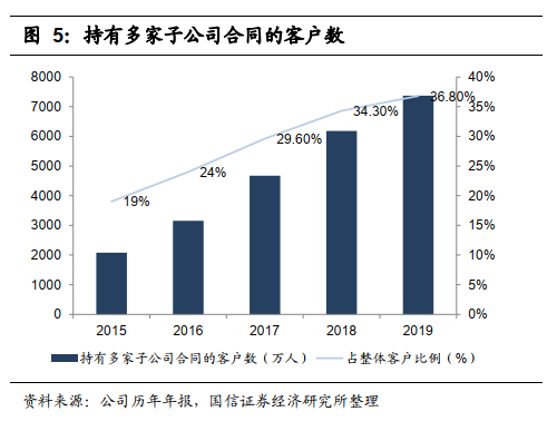 客户增加的同时,持有多家子公司合同的客户数占比持续增加。随着平安综合金融战略的深化,客户交叉渗透程度不断提高,客均合同数稳步增加,客户价值逐年提升。截至2019年末,个人客户中有7371万人同时持有多家子公司的合同,在整体客户中占比36.8%,占比较年初提升2.5个百分点。集团客均合同2.64个,较年初3.9%。2019年集团个人业务实现客均营运利润612.54元,同比增长13.0%。