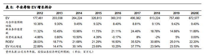 存量保单的价值会逐期作为利润转入股东权益,从而被逐渐摊薄。寿险企业通过持续的签出新单,以维持业务的充实度。2011-2019年平安NBV复合增速为22.9%,优于同业。其较高的NBV增速带来高ROEV。2019年,公司ROEV为25.0%,过去五年平均ROEV为27.9%。