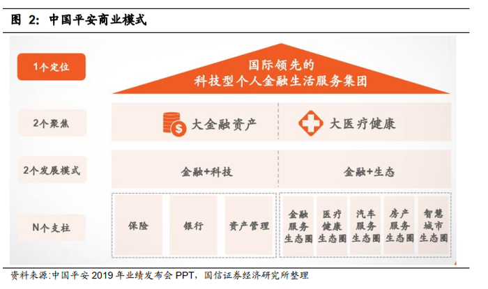 中国平安致力于成为国际领先的科技型个人金融生活服务集团。公司坚持“金融+科技”双轮驱动战略,在确保金融主业稳健增长的基础上,紧密围绕主业转型升级需求,持续加大科技投入,不断增强“金融+生态”赋能的水平与成效,支撑“金融服务、医疗健康、汽车服务、房产服务、智慧城市”五大生态圈建设。通过“一个客户、多种产品、一站式服务”的综合金融经营模式,公司为2亿个人客户和5.16亿互联网用户提供金融生活产品及服务。