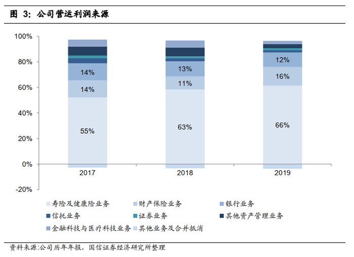 2019年,公司归母净利润为1494.07亿元,同比增长39.1%;归母营运利润为1329.55亿元,同比增长18.1%。公司寿险及健康险、财产险、银行、信托、证券、其他资产管理、科技业务营运利润占比分别为66.2%、15.7%、12.3%、2.0%、1.7%、3.5%、2.6%。