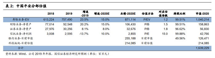 采用分部估值法,对平安寿险、平安产险、平安银行、平安证券、平安信托以及科技板块进行估值。