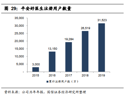 平安好医生:中国最大的互联网医疗健康服务平台。平安好医生依托自有医疗团队及自主研发的人工智能辅助诊疗系统,向用户提供及时、优质的在线诊疗服务,涵盖7×24小时在线咨询、健康管理、处方、转诊、挂号、第二诊疗意见及1小时送药等全流程服务。截至2019年末,平安好医生累计注册用户量超3.15亿,12月当月活跃用户数达6690万。