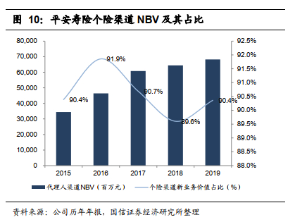 平安寿险优势突出,主要表现为:(1)对代理人销售渠道的一贯重视,强化重点从规模建设逐渐转移到效率建设,且运用科技、优才计划升级代理人队伍,整体新业务价值率和代理人产能呈现上升趋势;(2)近年来NBV快速增长,价值创造能力已经明显提速,ROEV高于同业, 且在未来几年都是可持续的;(3)具备超强利润储备,保证利润持续稳健增长。存量保单利润释放体现为“剩余边际”科目,2019年末平安寿险剩余边际余额为9184.16亿元,较期初增长16.8%,过去5年复合增速为29.1%;(4)传统分红万能均衡发展,利率风险敞口低于同业。