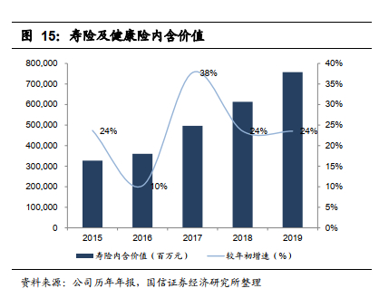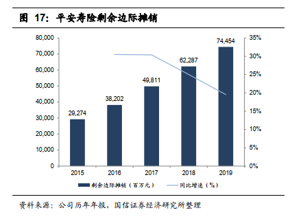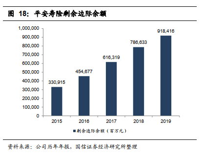 长期保障型业务的强劲增长促进剩余边际“池子”规模不断增长。截至2019年末,平安寿险剩余边际余额为9184.16亿元,较期初增长16.8%,主要源于长期保障型业务的强劲增长,利润“池子”规模较大且不断增长,为业绩提供安全边际。2019年剩余边际摊销为744.54亿元,同比增长19.5%。剩余边际是公司未来利润的现值,摊销模式在保单发单时刻锁定,摊销稳定不受资本市场波动影响。近年,剩余边际摊销规模同比增速较高,在资本市场波动可控的情况下,能保证利润的稳定快速增长。