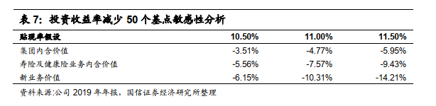 当前股价对应2020年PEV为0.90倍,当前股价充分反应了长端利率持续下行的悲观预期。根据2019年年报,如果投资收益率下降50bp,仍维持11%贴现率假设下,集团内含价值、寿险及健康险业务内含价值、有效业务价值分别下降4.77%、7.57%、10.31%。