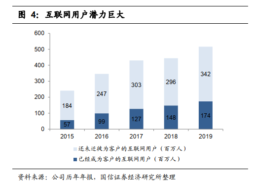 5.16亿互联网用户潜力巨大。平安聚集“一站式服务”,不断完善在线体验,打造更贴近用户的服务场景。截至2019年末,互联网用户量5.16亿,较年初增长16.2%,APP用户量4.70亿,较年初增长17.8%,平均每个互联网用户使用平安1.91项在线服务。平安持续推动个人客户与用户之间的迁徙转化,通过互联网平台提升客户的服务体验。