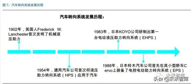 随着科技的迅猛发展,汽车转向系统也迎来了不断的升级和发展。20 世纪初,英国首次 发明了机械液压助力。1954 年,通用汽车公司首次将液压助力转向系统应用于汽车。