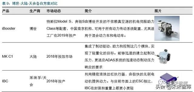 大陆集团于 2016 年研发出 MK C1,主要面向欧洲市场,最早在阿尔法罗密欧 Giulia 新 款车上搭载;随后于 2019 年在美国北卡罗来纳州的 Morganton 工厂量产,为美国市场 供货;2020 年计划在中国上海量产 MK C1 制动系统。相比 iBooster,MK C1 集成化更 高,将 ESC(车身稳定控制系统)与制动助力系统结合起来,用一个集成化的控制模块 实现了两种功能。由于集成化程度更高,具备体积小的优势,而弊端在于量产工艺较高, 以及可靠性不如 iBooster。目前奥迪 e-tron 系列,宝马 X5、X7 即将使用大陆集团的 MK C1。