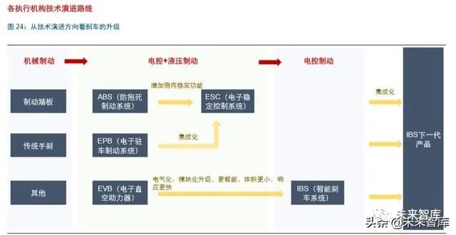 电控+液压制动是当期主流,未来将向线控制动升级。相较于下一阶段线控制动,电控+ 液压的方式是目前主流汽车采用的产品。汽车制动系统经过长期发展,已逐渐由传统液 压/气压制动发展到目前电控+液压方式,主要包括制动防抱死系统(ABS)/电子稳定控 制系统(ESC)、电子驻车系统(EPB)等,未来向线控制动升级当中, IBS 是核心产品。