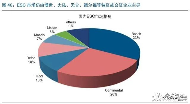 ESC 市场仍由博世、大陆、天合、德尔福等独资或合资企业占据大部分市场,由于技术 难度较大,国内实现技术突破的企业有限,目前代表企业有亚太股份、伯特利等。