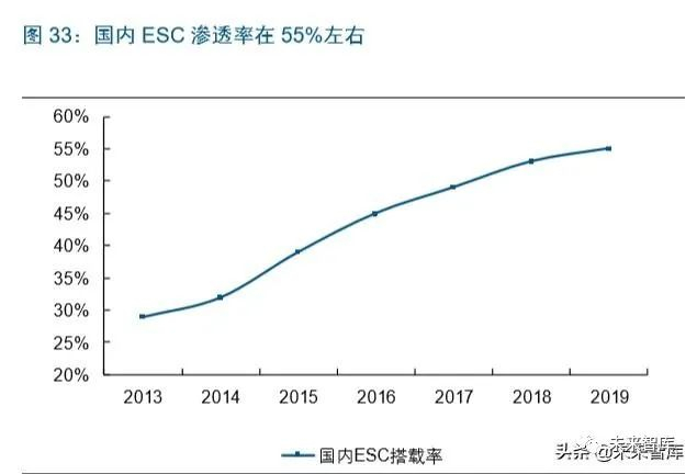 1) 我们认为未来随着汽车安全配置的进一步加强,已广泛搭载使用的 ABS 有望逐步 升级为 ESC,推动 ESC 渗透率继续提升,到 2023 年 ESC渗透率有望达 70%;