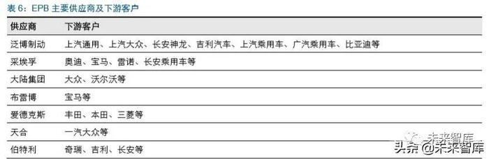国内 EPB 市场主要为采埃孚-天合、大陆等国际具体主导,自主品牌也具备量产配套能 力,已经实现量产的有伯特利和浙江力邦合信智能制动系统股份有限公司等,投入研发 的主要有万向钱潮、亚太股份等。