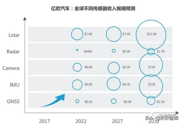 据法国行业研究公司Yole测算,未来数年,传感器收入规模将进入高速发展期。其中,激光雷达、IMU、摄像头排名前三。
