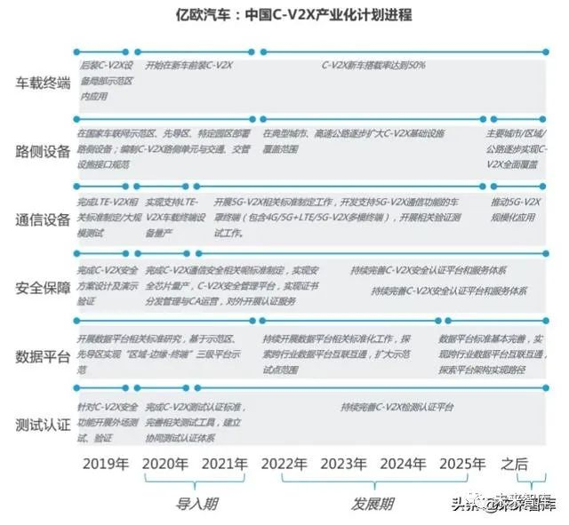 因此,即便政府在4年前就已开始基础设施的建设改造,但根据中国智能网联汽 车产业创新联盟(CAICV)、IMT-2020(5G)推进组C-V2X工作组、中国智能 交通产业联盟(C-ITS)、中国智慧交通管理产业联盟(CTMA)联合发布的 《C-V2X产业化路径和时间表研究》白皮书,2020年仍被认为是C-V2X产业化 的“导入期”,此后在经历4年的“发展期”后,才能进入“高速发展期”。