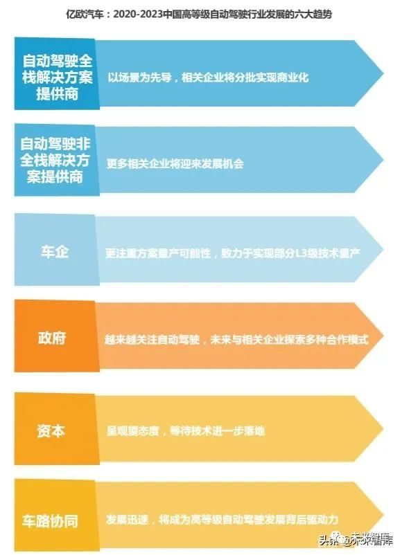 通过对自动驾驶全栈解决方案提供商、自动驾驶非全栈解决方案提供商、车企、 政府、资本、车路协同等多方力量进行研究,亿欧汽车认为,未来三年,中国 高等级自动驾驶行业将向以下六个方向发展:
