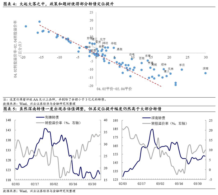 这里以转债估值代表的预期来解释是比较通顺的,虽然从财务报表上看到基本面收益的盈利成果还需时日。例如深南转债虽然在3月份一度出现主动杀估值的调整,但:1)截至本周五其价格/转股溢价率为152.60元/9.76%,整体而言相比1月23日的137.50元/15.62%高出一些;2)以4月2日对比2月4日,深南转债平价提高近30元,转股溢价率下降约12个百分点,估值压缩程度也低于多数品种。