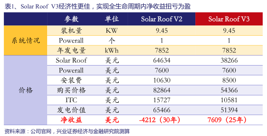 ●由于V3销售价格大幅下降,,V3比V2更具经济性。以9.45KW系统为例,且根据建议搭配一个储能Powerall,则Solar Roof V2在系统生命周期(30年内)净收益为-4212美元,而V3可在全生命周期(25年内)收回全部投资成本,并产生7609美元的正收益。因此V3相比V3经济性更佳,实现系统净收益扭亏为盈,经济性提升将成为V3放量的关键转折点。