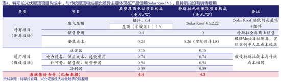 ①已知Solar Roof V3 在美国的售价(4.3美元/W),假设Solar Roof V3在美国市场的通用成本(逆变器+电力设备+非技术成本等)与屋顶+组件模式相同