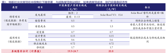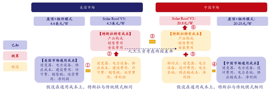 ⑤ 在中国市场,将Solar Roof V3特有成本+非通用成本加总,测算Solar Roof V3在中国的售价