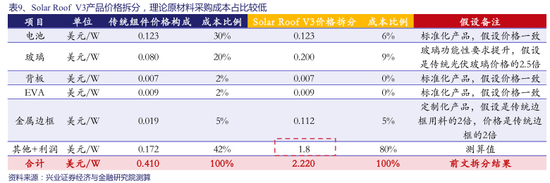 ●由于Solar Roof V3结构与传统组件高度相似,我们通过产品结构拆分出Solar Roof大致的成本构成。其中,我们对电池、背板、EVA等标准化产品价格假设与传统组件一致,玻璃、边框工艺较为成熟,即使定制化预计成本增加也有有限,预计成本为传统组件的2.5-4倍。