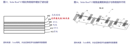 ●从专利展示中,可以看出产品结构与传统组件相似,其中,玻璃、EVA、电池、背板均与传统组件一致。差异主要体现在两方面:(1)玻璃和电池之间增加滤光层,能增加产品美观度,但损失了发电效率;(2)产品背面金属框架设计与传统组件不同,预计金属框架用料多于传统组件。