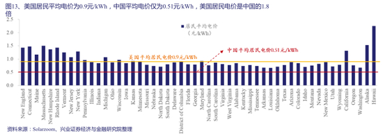 ●不同于中国,美国电费工业用户不补贴居民用户,又因居民用电量少,居民电价普遍较高,平均电价为0.9元/kWh,而中国居民电价平均水平仅为0.5元/kWh,即美国居民平均电价是中国平均水平的仅2倍。