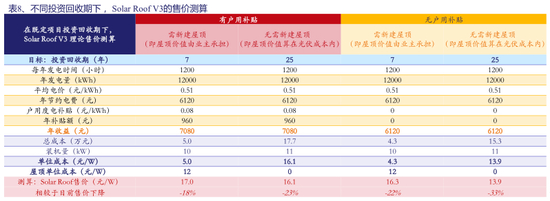 我们认为对于用户来说,有2个对Solar Roof V3需求意愿提升的临界点:1、针对需新建屋顶的业主,实现投资回收期7-8年,即与传统模式相同;2、针对无需新建屋顶的业主,实现全生命周期内收益抵消屋顶建设成本,即Solar Roof V3 屋顶免费。